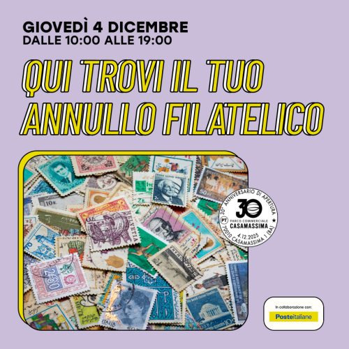 Presso Poste Italiane nella galleria sarà disponibile lo speciale timbro postale filatelico per celebrare il 30° anniversario dell’apertura del Parco Commerciale di Casamassima.