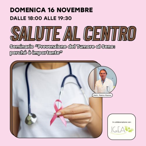 Domenica 16 novembre, partecipa al seminario gratuito per imparare il valore della prevenzione del tumore al seno con il Dott. Pietro Monno. Riceverai anche un voucher per un check-up ematico completo, a cura del Poliambulatorio Igea – centro prelievi – multimedica e prevenzione.