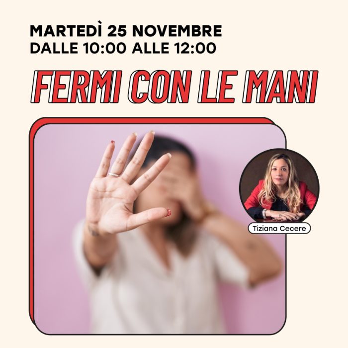 - Nel pomeriggio, dalle 16:00, la Presidente dell’Associazione “Fermi con le Mani”, Avv. Tiziana Cecere, sarà ospite ai microfoni di MgRadio in galleria per un momento di dialogo e riflessione.