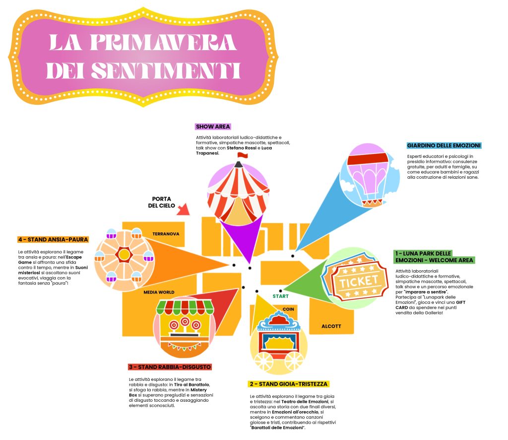 - Gioca al “Lunapark delle Emozioni“: stand divertenti per bambini, ragazzi e famiglie, per scoprirsi ed “imparare a sentire” dalle ore 16:00